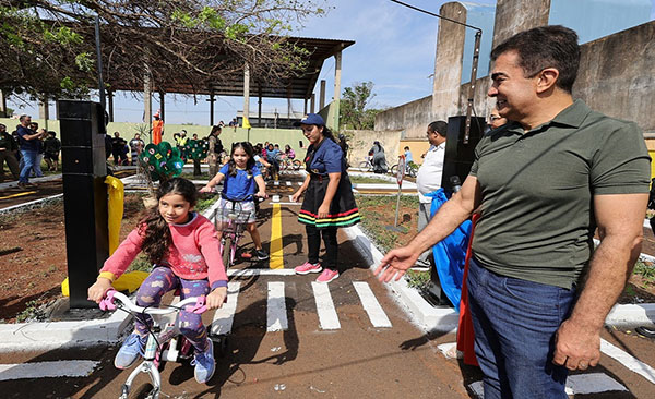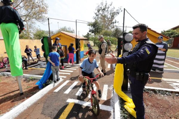 A reinauguração da mini pista foi o ponto alto do evento. O espaço, localizado ao lado da quadra de esportes, oferece uma simulação real de circulação nas ruas, com semáforos, rotatórias e sinalizações horizontais e verticais. A estrutura permite que as crianças aprendam na prática como pedestres, ciclistas e motoristas devem se comportar, reforçando conceitos de respeito, responsabilidade e convivência no trânsito.
