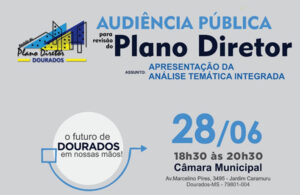 A Prefeitura de Dourados, por meio da SEPLAN (Secretaria Municipal de Planejamento), realizará a 2ª Audiência Pública do processo de revisão do Plano Diretor. A audiência será no dia 28 de junho, às 18h30, na Câmara Municipal de Vereadores.