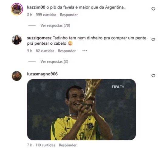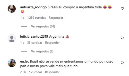 Nos comentários, brasileiros criticaram a publicação e ironizaram a comparação. Muitos compararam dados econômicos e até disseram frases como: “Vai pentear esse teu cabelo” e “Pelé é Melhor que Maradona”.