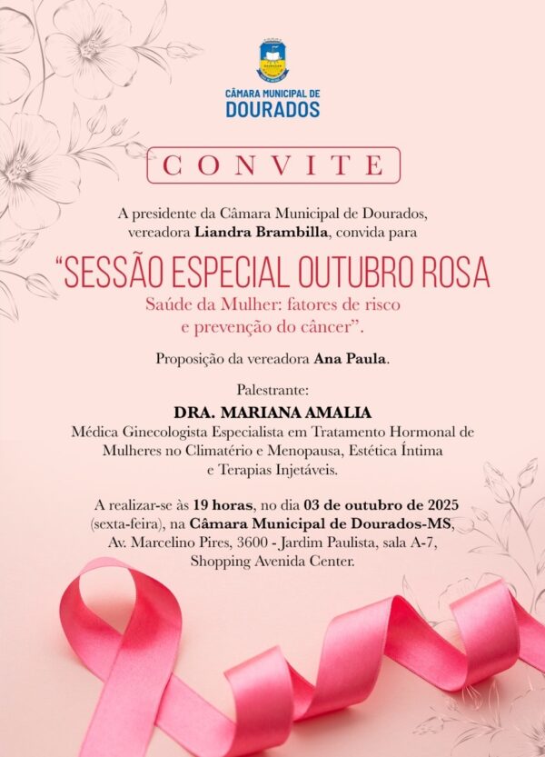 A Câmara Municipal de Dourados realiza, nesta sexta-feira (3), às 19h, Sessão Especial Outubro Rosa, em alusão ao mês dedicado à prevenção e ao combate ao câncer de mama.