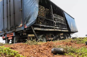 Caminhão carregado de cerveja pega fogo após pneu estourar na BR-163