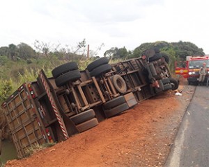 Um caminhão carregado com tijolos tombou na manhã desta quinta-feira (2), na MS-040, próximo a Campo Grande. O veículo vinha de Brasilândia a caminho de um depósito de materiais de construção na Capital.