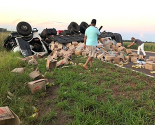 Entre a mercadoria transportada, estavam caixas de leite, bolachas e óleo de cozinha. O veículo ficou destruído.
