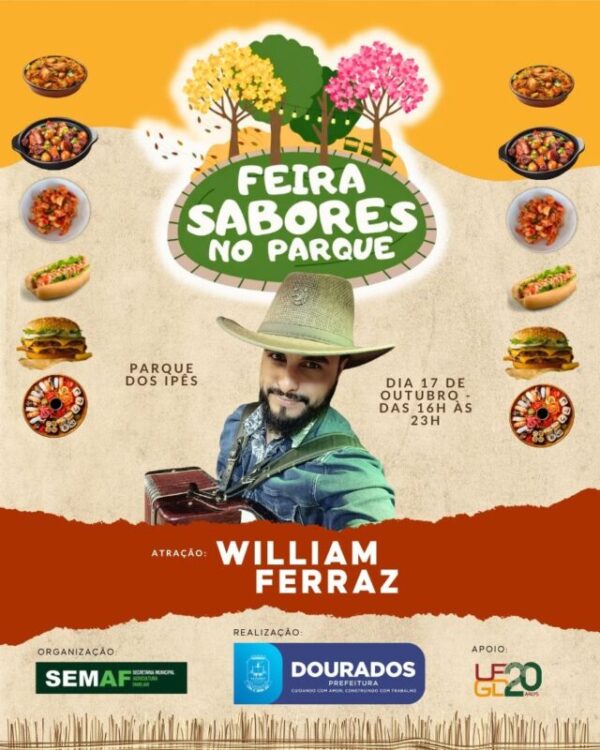 A Feira Sabores no Parque promete mais uma noite de boa música, gastronomia e lazer nesta sexta-feira (17), no Parque dos Ipês, em Dourados. O evento contará com a apresentação do cantor Willian Ferraz, que trará um repertório eclético para animar o público e garantir um ambiente de descontração e entretenimento.