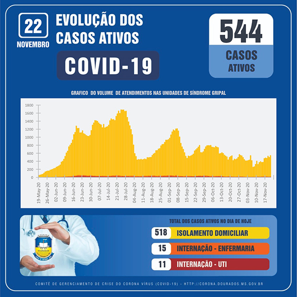 De acordo com o Boletim epidemiológico divulgado ontem (23), em Dourados existem 544 casos de pacientes ativos da Covid-19. Já a taxa de ocupação de leitos de UTI é de 87%.