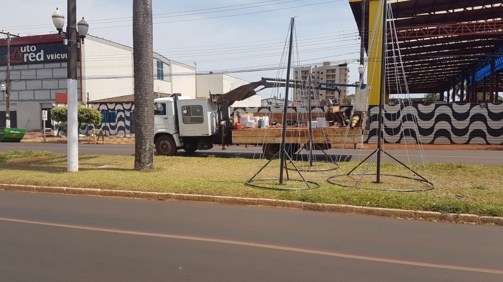Estrutura para a decoração de final de ano do centro de Dourados começa a ser montada (Foto - Marcos Pierry)