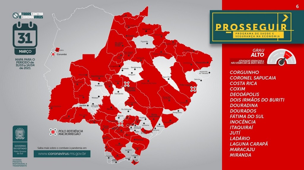 O mapa situacional do Prosseguir apresentado na quarta-feira (31) mostra redução de quatro para uma o número de cidades classificadas na bandeira cinza. No novo mapa apenas Sidrolândia saiu do grau alto para o extremo, quando é recomendado apenas o funcionamento de atividades essenciais.