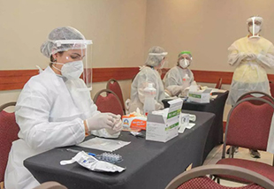Profissionais da saúde em ponto de testes da covid-19 na Capital. (Foto: Marcos Maluf)