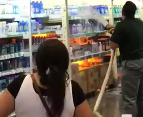 Brigadista tenta controlar chamas em prateleira de produtos (Foto - Campo Grande News)