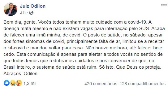 Na postagem, Odilon alertou seguidores para os perigos da doença e criticou o acolhimento da irmã no sistema de saúde pública. Segundo ele, apesar de fortes sintomas de Covid-19, principalmente dificuldade para respirar, Tereza teria recebido apenas receita do kit-Covid e foi orientada a voltar para casa.