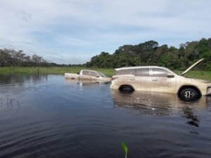 Uma caminhonete Hilux e uma SW4, ambas roubadas, foram encontradas dentro d’água, em uma região de alagados, no município de Aquidauana, a 131 quilômetros de Campo Grande. Os veículos estavam abandonados e os suspeitos não foram localizados.