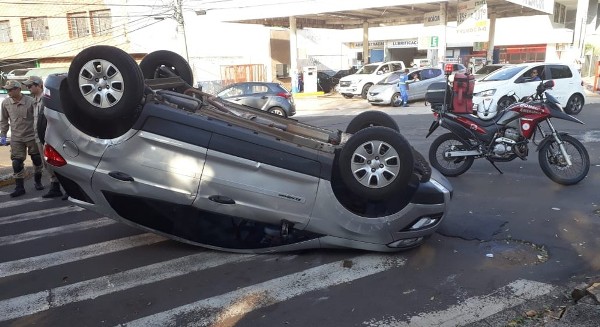 Dois carros bateram no Centro de Campo Grande, um deles capotou e motoristas e passageiros saíram ilesos. O acidente aconteceu no início da manhã desta sexta-feira (6).