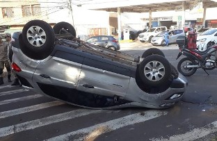 O veículo que capotou ficou com as rodas para cima. Apesar da imagem forte, ninguém se machucou.