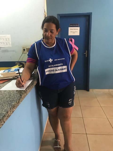 A equipe mandou confeccionar um colete de identificação do profissional que esta no acolhimento, foi feito escala entre os Agentes Comunitários de Saúde (ACS) da equipe de forma que todos os dias um deles faz o trabalho de acolhimento, iniciando as 06h45min.