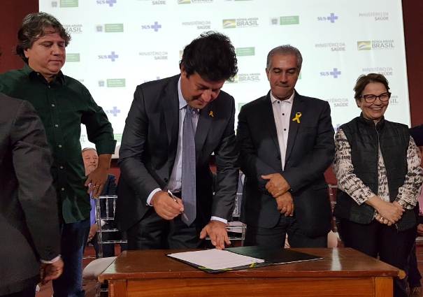 Mandetta, acompanhado da ministra da Agricultura, Pecuária e Abastecimento (Mapa), Tereza Cristina Corrêa da Costa Dias e do governador Reinaldo Azambuja, assinou, no Centro de Convenções Rubens Gil de Camillo, na Capital, atos para habilitação de recursos em saúde; anúncio de recursos para ações e investimentos em saúde no Estado e municípios do MS e a entrega de caminhões destinados à coleta de lixo para quatro municípios, no valor de R$ 167 milhões, contemplando praticamente todos os municípios sul-mato-grossenses.