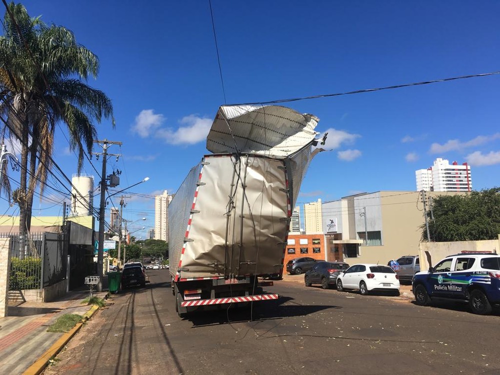 Caminhão baú enrosca em fios de energia elétrica em MS (Foto: Alexandre Cabral/TV Morena)