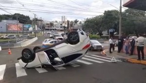 Uma grávida saiu ilesa após o carro dela parar de rodas para cima após ser atingida por outro veículo na tarde dessa sexta-feira (28), na região central de Campo Grande.