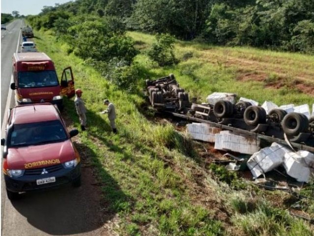 Uma carreta carregada com matéria-prima de celulose tombou em uma curva na BR-158, na manhã deste domingo (16), em Três Lagoas, 338 quilômetros de Campo Grande. O condutor, que não teve o nome divulgado, sofreu ferimentos leves e foi socorrido pelo Corpo de Bombeiros a uma unidade de saúde.