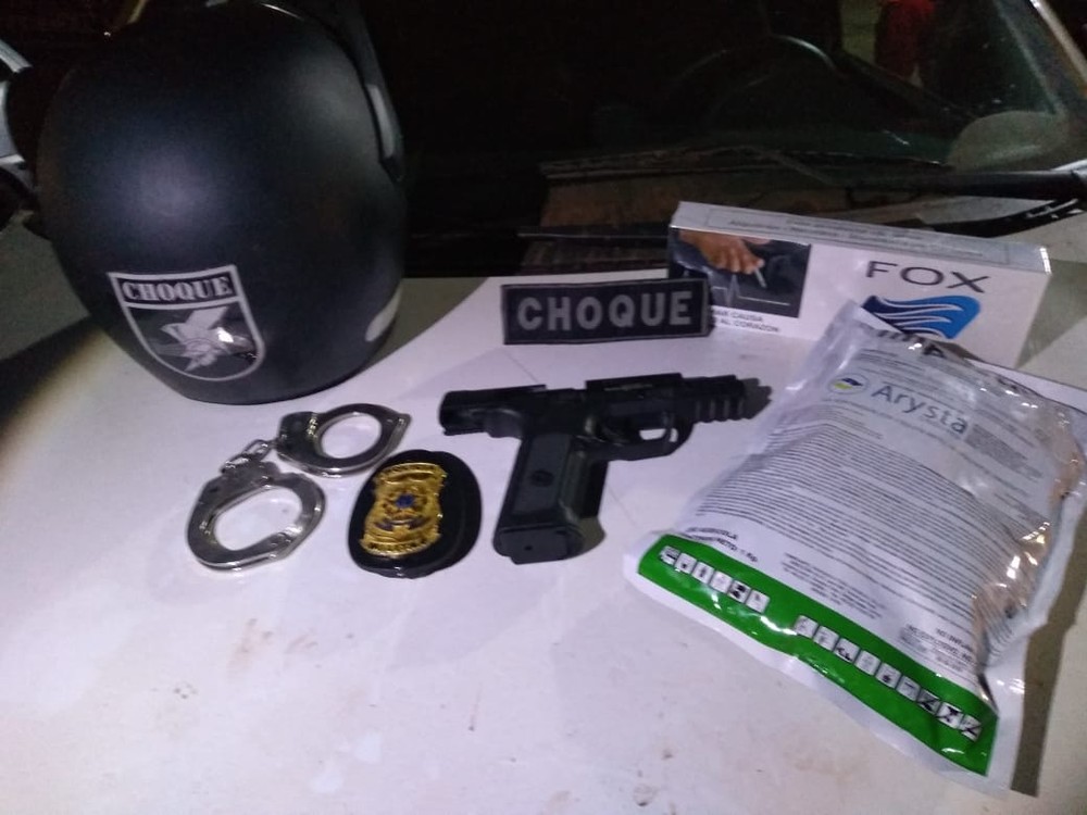 Parte do cigarro e do agrotóxico apreendido pelo Choque na noite desta segunda-feia em Campo Grande, além do simulacro de pistola, da algema e do distintivo da PM (Foto: Batalhão de Choque/Divulgação)