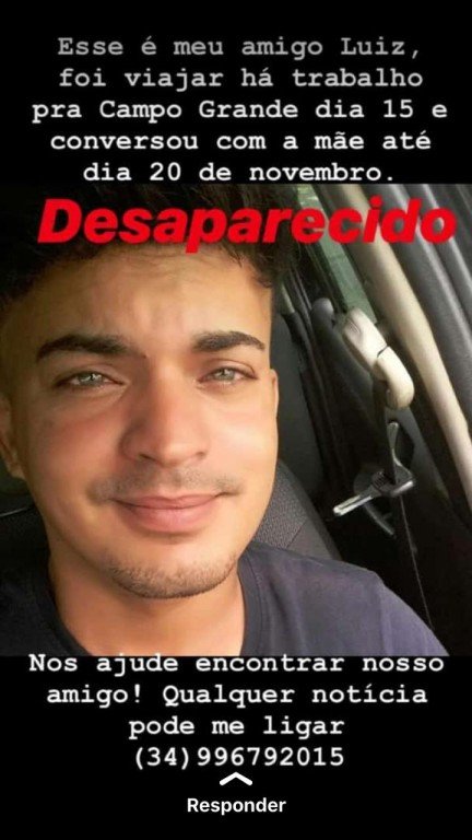 Um mineiro identificado como Luiz Fernandes Soares Monteiro, de 31 anos, está desaparecido desde o último dia 20 de novembro. Na data, Luiz disse a amigos que estaria a caminho de Campo Grande para trabalhar.