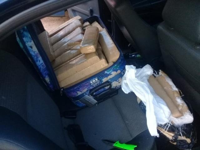 Em duas malas que estavam no carro os policiais rodoviários federais encontraram vários tabletes de maconha pensando 155 quilos.