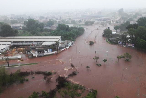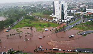 Na rotatória da Avenida Rachid Neder com a Ernesto Geisel, também na região central, a via está totalmente alagada. A imagem de cima é impressionante, com a água que saiu do córrego Segredo espalhada pela pista.
