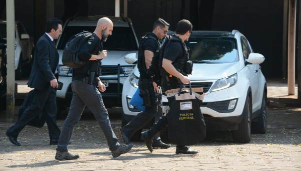 Policiais federais saíram da Governadoria, em Campo Grande, carregando malotes. (Foto: David Mello/TV Morena)