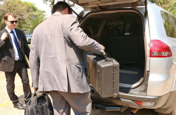 Policiais federais deixam a Governadoria com mala. (Foto: Henrique Kawaminami)