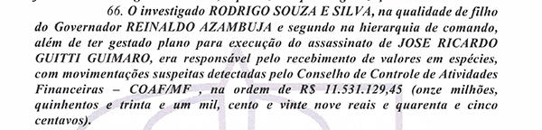 O advogado Rodrigo Souza e Silva, 29 anos, filho do governador Reinaldo Azambuja (PSDB), teve R$ 11,531 milhões em movimentações suspeitas, segundo o COAF (Conselho de Controle de Atividades Financeiras). A informação consta do despacho do ministro Felix Fischer, do Superior Tribunal de Justiça, que decretou a prisão do herdeiro do tucano na Operação Vostok.