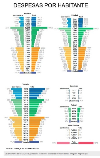 O TJMS, segundo o levantamento, tem gasto mensal médio de R$ 100 mil por magistrado no ano passado, diante da média nacional de R$ 49,7 mil. Trata-se do maior valor do país –como comparação, o Tribunal de Justiça de Santa Catarina, segundo maior gasto, registrou despesas de R$ 74 mil por juiz ou desembargador, acima até mesmo dos tribunais superiores.