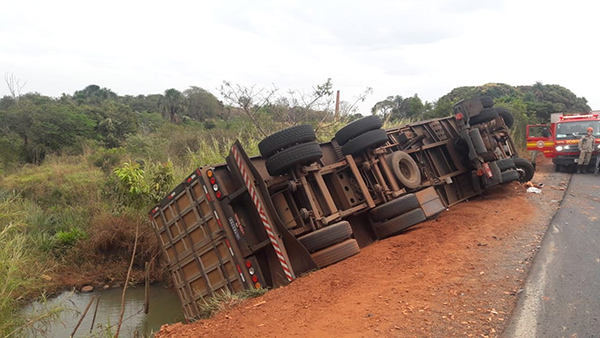 Um caminhão carregado com tijolos tombou na manhã desta quinta-feira (2), na MS-040, próximo a Campo Grande. O veículo vinha de Brasilândia a caminho de um depósito de materiais de construção na Capital.