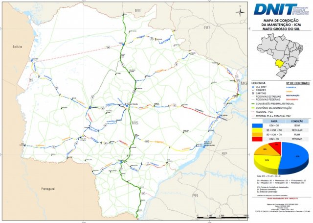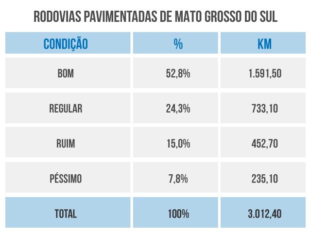 O levantamento exclui a BR-163, que liga Mundo Novo a Sonora e é administrada pela iniciativa privada. O estudo relativo ao primeiro trimestre de 2018 avalia que 24,3% (733 km) estão regular, 15% (452 km) são ruim e 7,8% (235 km) foram classificadas como péssimas.