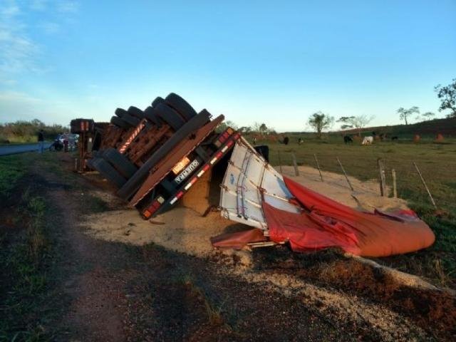 Uma carreta de soja atrelada a dois semirreboques tombou às margens da MS-276, na região do distrito de Amandina, em Ivinhema. O acidente ocorreu depois que o motorista perdeu o controle do veículo, um Volvo FH12 com placas de Dourados.