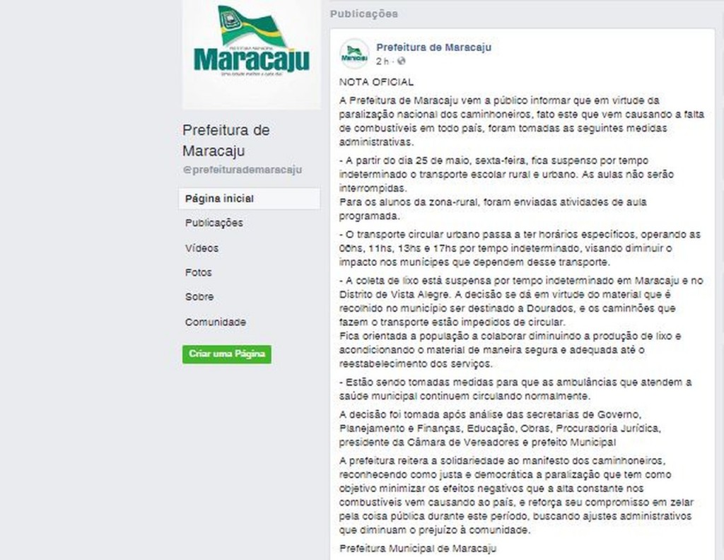 A decisão foi publicada na página no município no Facebook. A prefeitura aponta que tomou essa decisão em razão da paralisação nacional dos caminhoneiros, o que está causando a falta de combustível na cidade e em todo o país.