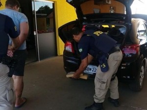 Policiais retirando droga do carro que era conduzido por jovem de 21 anos (Foto: PRF)
