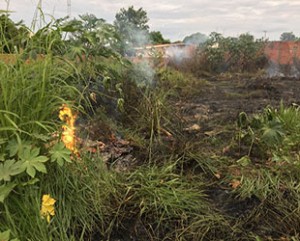 No terreno há muito mato, restos de madeira e entulho. O Corpo de Bombeiros controlou as chamas, mas antes, moradores jogaram água com mangueira de jardim.