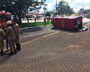 Ambulância do Corpo de Bombeiros tombou na avenida Mato Grosso em MS (Foto: Graziela Rezende/ TV Morena)