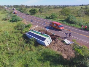 Um ônibus bateu na traseira de um caminhão e tombou às margens da BR-267 em Bataguassu, na manhã desta quarta-feira (4). Havia 14 pessoas dentro do coletivo e todas tiveram ferimentos considerados leves pelo Corpo de Bombeiros.
