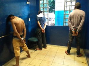 Policiais militares da Força Tática prenderam três suspeitos de furto na manhã desta segunda-feira (2), no bairro Guanandi, região sul de Campo Grande. Os homens se envolveram um acidente na avenida Gunter Hans, em frente do Hospital Regional. Um policial militar estava de folga, em um ponto de ônibus esperando uma carona, quando desconfiou e deu voz de prisão aos envolvidos.