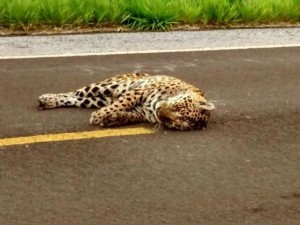 Uma onça-pintada foi encontrada morta, possivelmente vítima de atropelamento, na BR-262, próximo a Miranda. O animal foi fotografado por um casal que seguia na rodovia, no final da tarde desta segunda-feira (19).