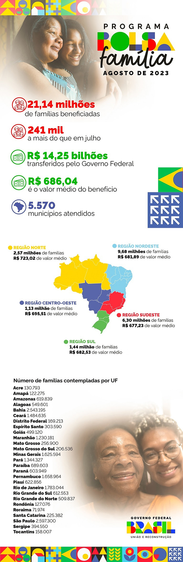 O Bolsa Família teve um aumento de 1,15% no número de beneficiários em agosto na comparação com julho. Os repasses neste mês chegam a 21,14 milhões de famílias, 241 mil a mais em relação à lista anterior. Ao todo, R$ 14,2 bilhões serão transferidos às famílias pelo Governo Federal, aumento de 1,55% em comparação a julho. O valor médio do benefício é de R$ 686,04.