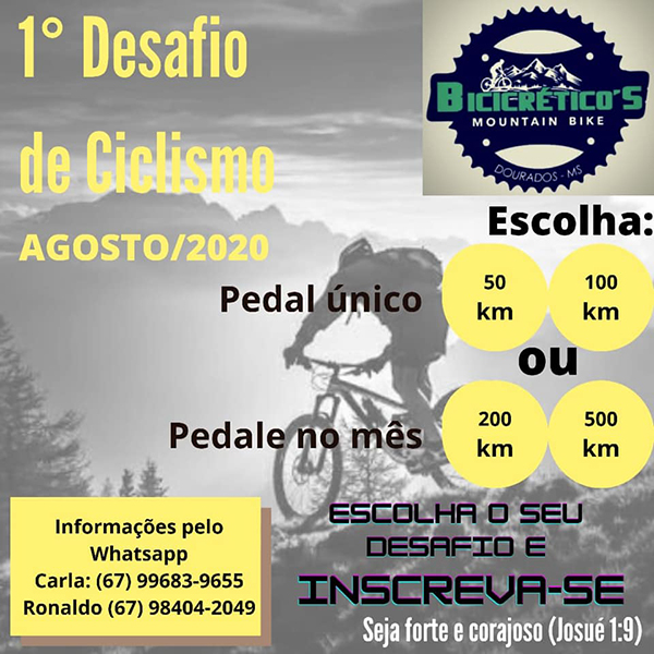 O grupo de Pedal Los Bicicrético’s de Dourados-MS realizará o 1º Desafio Los Bicicrético’s de Ciclismo. O evento ocorrerá durante todo o mês de agosto, onde os atletas terão do dia 1º ao dia 31 do referido mês para completarem uma das 4 modalidades do desafio, podendo também inscrever-se em todas.