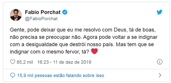 “Gente, pode deixar que eu me resolvo com Deus, tá de boas, não precisa se preocupar não. Agora pode voltar a se indignar com a desigualdade que destrói nosso País. Mas tem que se indignar com o mesmo fervor, tá?”, disse.