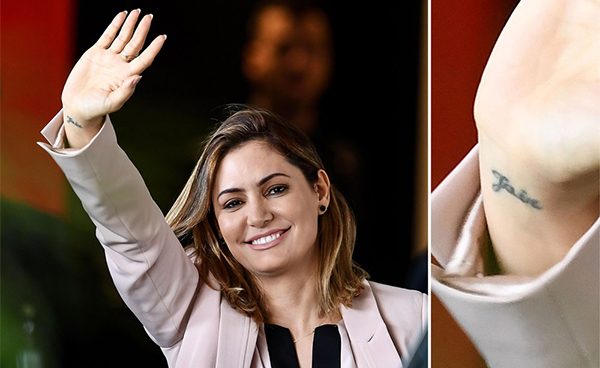 Vestindo um discreto conjunto cor de rosa, Michele, no entanto, deixou à vista a tatuagem que tem no punho direito, na qual se lê: Jair. Uma homenagem ao presidente eleito.