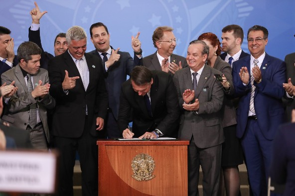 O presidente da República, Jair Bolsonaro, e deputados favoráveis ao desarmamento durante assinatura do decreto na última terça (7) — Foto: Marcos Corrêa/Presidência da República