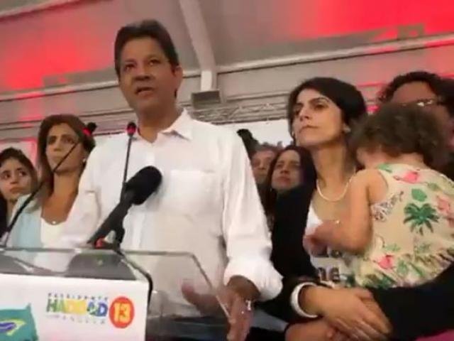 Haddad subiu ao palco acompanhado da vice, Manoela d’Ávila, que carregava sua filha Laura no colo, do ex-candidato à presidência pelo Psol, Guilherme Boulos, da ex-presidente Dilma Rousseff e de outros políticos de esquerda.