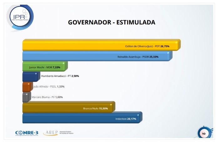 O IPR também divulgou a sondagem espontânea, quando não apresenta o nome dos candidatos. Odilon também aparece na frente, com 16,25%, contra 12,75% de Reinaldo e 2,17% de Mochi.