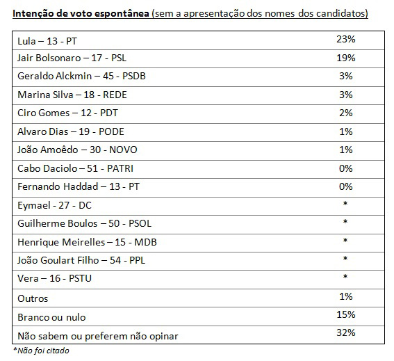 O segundo lugar fica com Marina, com 14%, seguida por Alckmin com 9%, Ciro com 8%, Álvaro com 4%, Haddad com 3% e Amoêdo com 2%. Três candidatos são citados com 1%: Cabo Dacioli (Patri), Goulart e Vera Lúcia (PSTU).