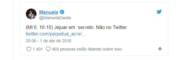 A presidenciável, Manuela D’Ávilla, retuitou passagem bíblica onde critica o procurador Deltan Dallagnol, que diz estar em jejum pela prisão de Lula.
