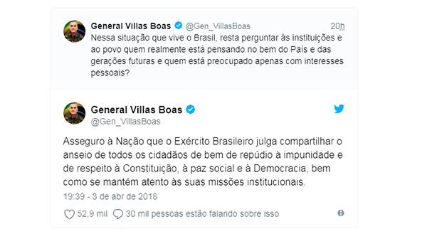 A questão ganhou notoriedade desde a noite de ontem quando o comandante do Exército, general Eduardo Villas Bôas, postou em sua conta do Twitter uma opinião sobre o julgamento de hoje do Supremo Tribunal Federal (STF) do pedido de habeas corpus do ex-presidente Luiz Inácio Lula da Silva: